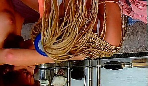 Sexy curvy brunette uses a purple dildo in the kitchen