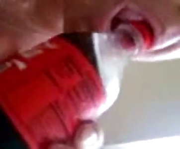 Thin first-timer friend opening up her poon with Coca-cola bottle
