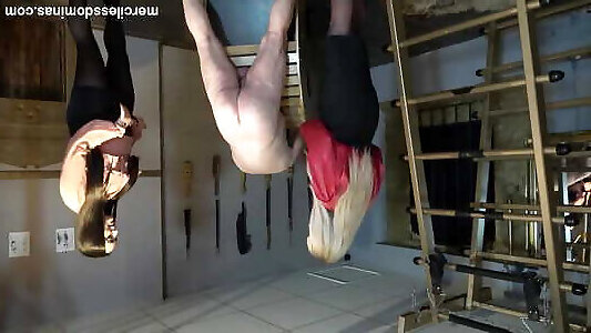 She is trussed with tape colors by girldfriend in compete restrain bondage gauze
