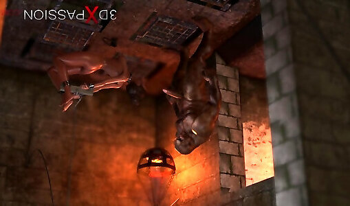 Ferocious monsters penetrate a teen victim in the dark dungeon space