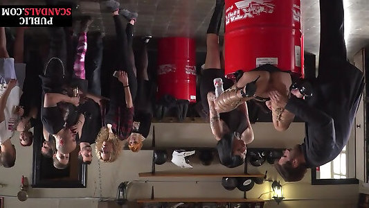 Public BDSM sub spanked and 3some used in voyeur sex