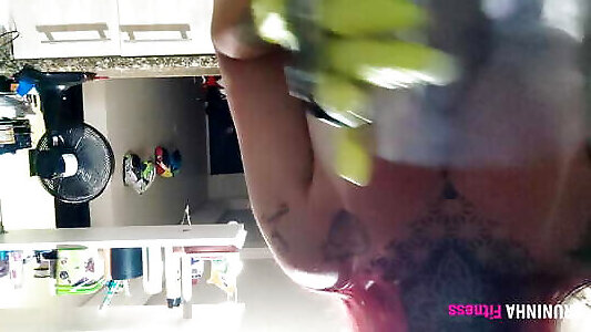 Exhibited will wash the dishes without a top, just to show off her tanlines