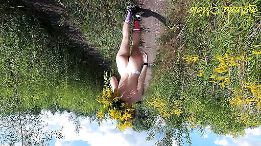 Outdoor erotica girl with a beautiful figure walking in thongs and bare-chested in nature Anna Mole