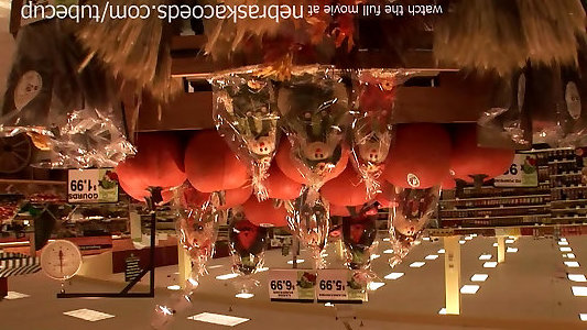 رنگ پریده towheaded زن شوقین, کون roams در سوپر مارکت لخت سینه
