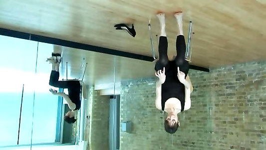 yoga e stretching in eleganti abiti da segretaria a casa con modelli di fitness come dare atomic girl wedgies con mutandine