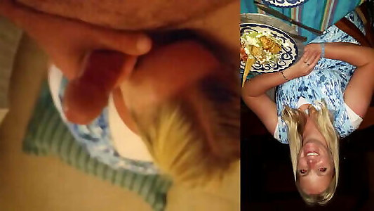 bella bionda moglie in ginocchio fellatio con un colpo di sperma